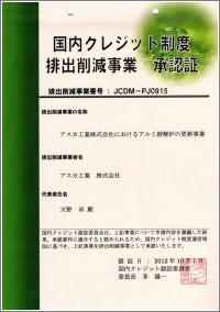 昨年、工場移転に伴い、経済産業省の推進する「温室効果ガス排出減量連動型中小企業グリーン投資促進事業」の一環である「国内クレジット制度・排出削減事業」としてご承認頂き、順次削減計画を遂行してまいりました。