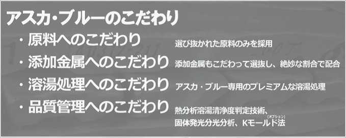 「アスカ・ブルー」は、ダイカスト向けのアルミニウム合金 ADC12(ADC12.1)向けに徹底的にこだわって開発された製品です。 長年の経験を生かし、原料の質はもちろん、添加金属の質までこだわって選択しています。 そして一番良い特性のダイカスト製品が出来るよう、絶妙な配合で生産されています。 また、溶湯処理も一手間をかけており、アスカ・ブルー材の為の特別な処理を行っています。